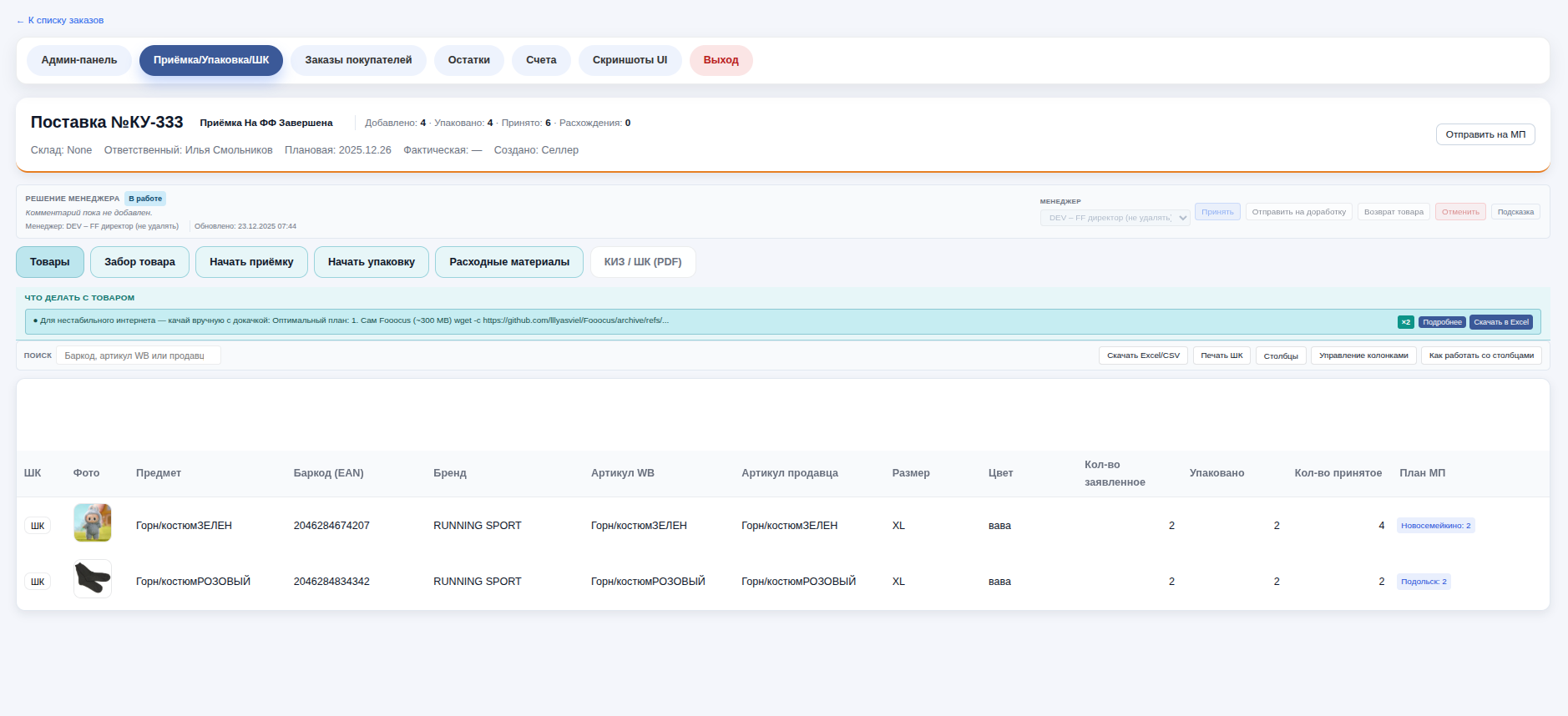 Здесь ведётся приёмка по поставке: список позиций, план/факт, статусы и переход в упаковку. Доступны фильтры, экспорт и быстрые действия по заявке.