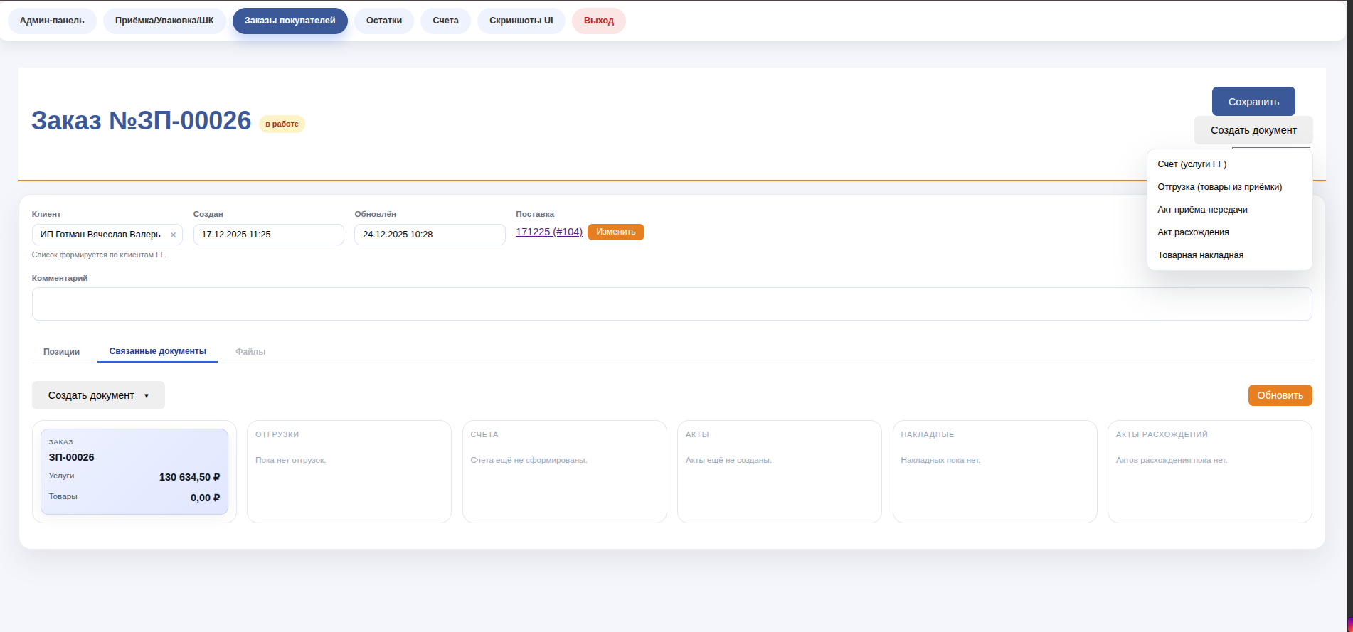 Документы создаются прямо из заказа: счёт, отгрузка, акт приёма‑передачи, акт расхождения и накладная. Созданные файлы группируются по типам и остаются связаны с заказом и поставкой.