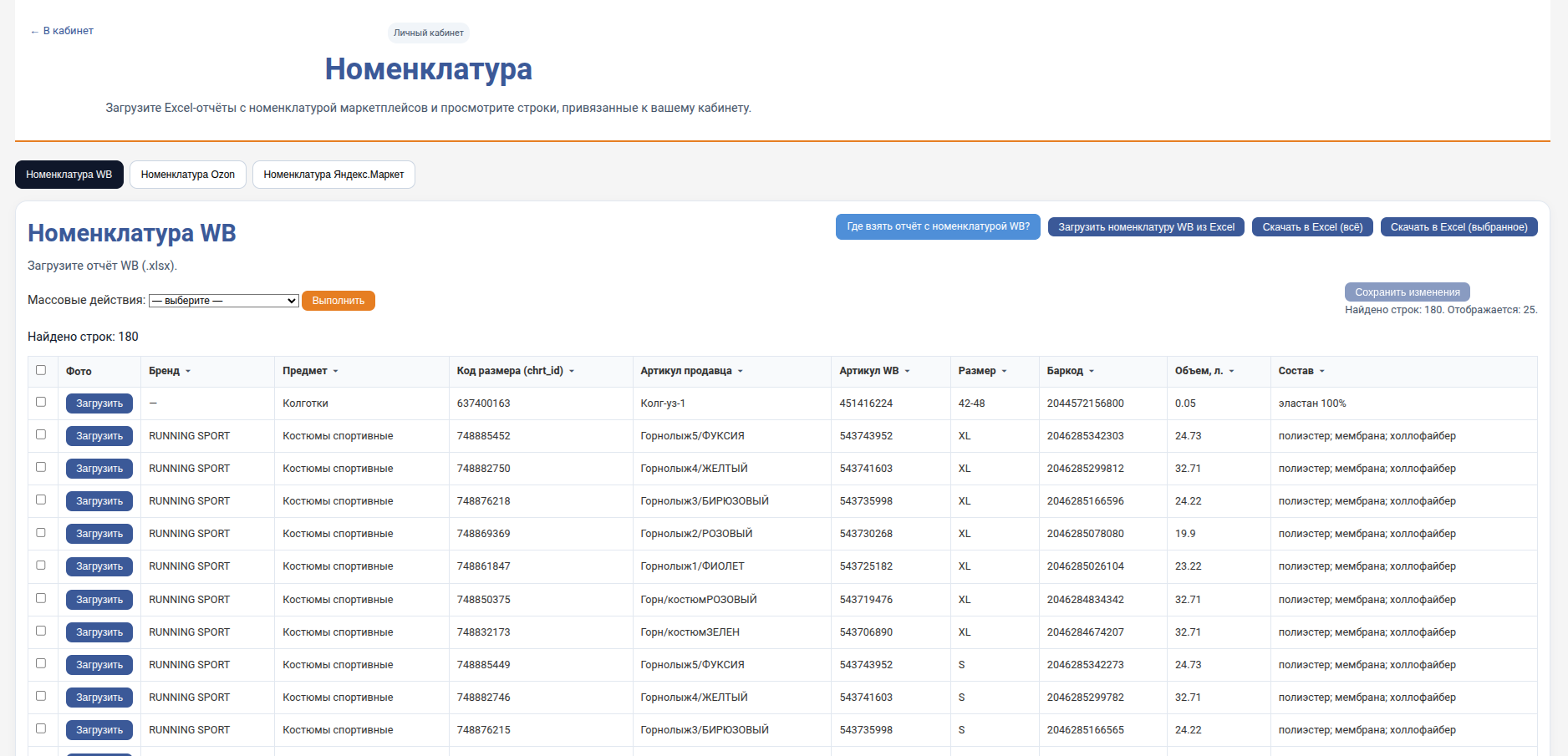 Номенклатура хранит карточки товаров, загруженные из Excel. Раздел позволяет быстро отфильтровать строки, загрузить фото и выгрузить выбранные позиции.